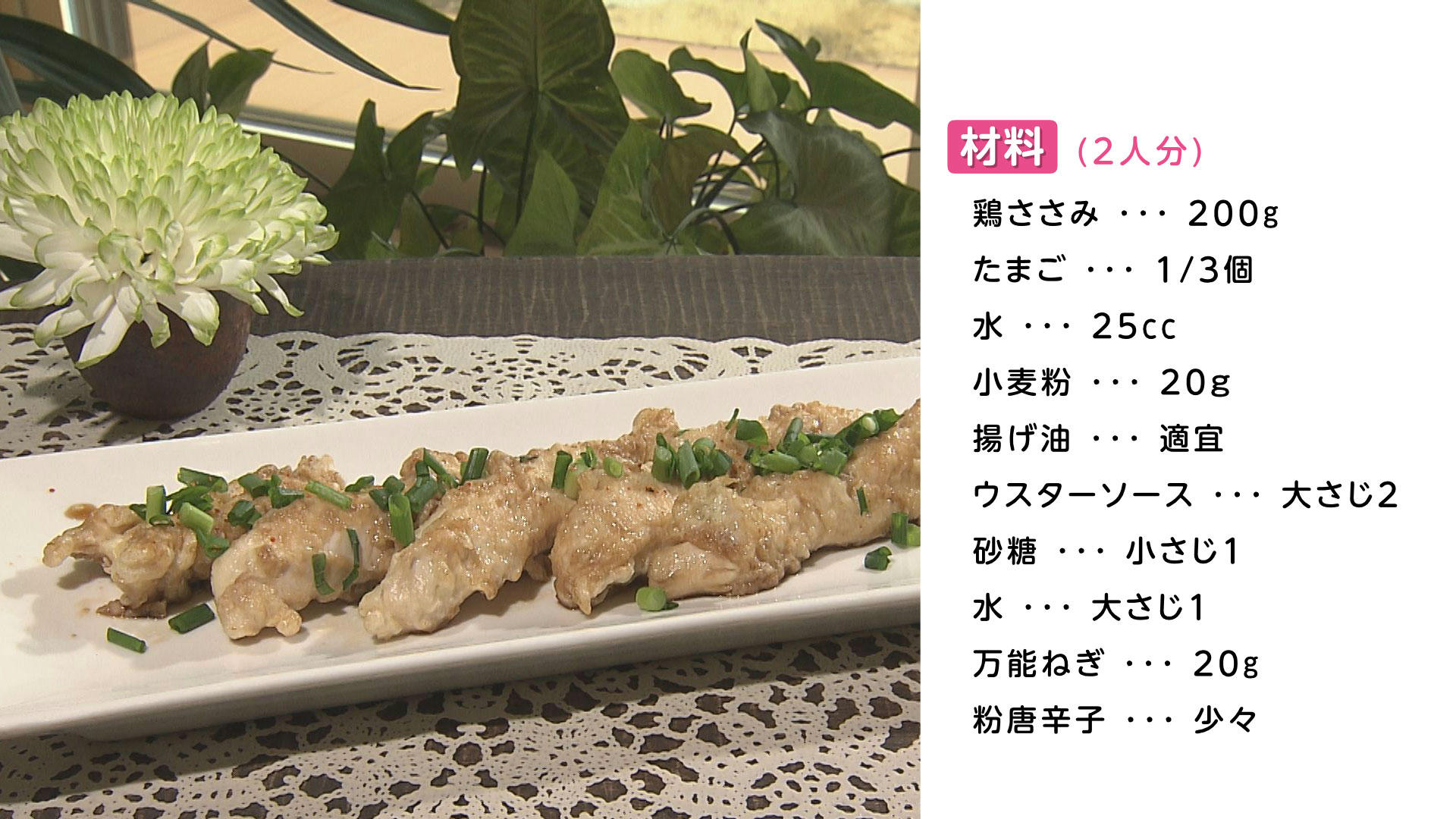 ・鶏ささみの筋にそって切り込みを入れ、包丁の背で抑えながら筋をとる・鶏ささみを半分に切る・ねぎを小口...