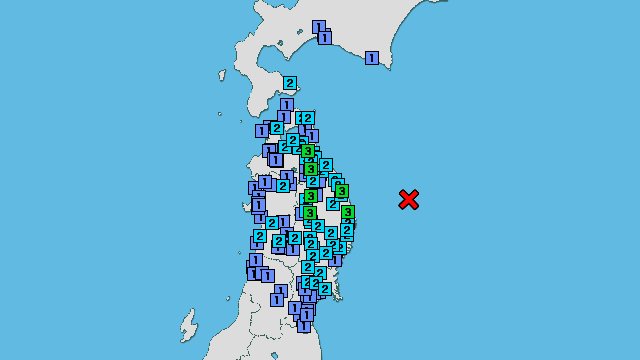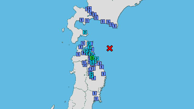 | 震度3 | 東北町上北南 青森南部町苫米地 宮古市田老 普代村銅屋 盛岡市薮川 岩手町五日市 |