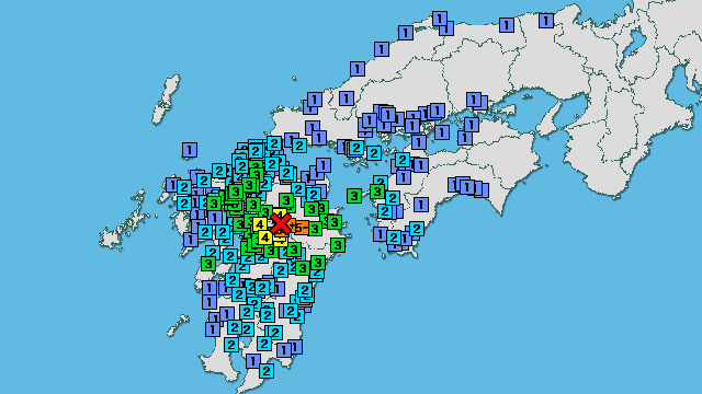 | 震度3 | 南阿蘇村河陰 南阿蘇村河陽 熊本小国町宮原 菊池市隈府 菊池市七城町 熊本東区佐土原 熊本南区富合町 熊本南区城南町 熊本北区植木町 玉名市横島町 玉名市天水町 山鹿市老人福祉センター 山鹿市菊鹿町 山鹿市鹿央町 山鹿市山鹿 宇土市浦田町 合志市竹迫 合志市御代志 大津町引水 大津町大津 菊陽町久保田 嘉島町上島 益城町宮園 山都町今 天草市五和町 竹田市直入小学校 日田市上津江町 日田市中津江村栃野 日田市前津江町 九重町後野上 玖珠町帆足 大分市新春日町 大分市舞鶴町 臼杵市臼杵 津久見市宮本町 由布市庄内町 佐伯市蒲江蒲江浦 佐伯市春日町 佐伯市宇目 佐伯市上浦 豊後大野市三重町 豊後大野市千歳町 豊後大野市大野町 豊後大野市清川町 豊後大野市朝地町 豊後大野市犬飼町犬飼 豊後大野市緒方町 八幡浜市保内町 伊方町湊浦 飯塚市立岩 嘉麻市上臼井 久留米市津福本町 久留米市小森野町 久留米市城島町 久留米市北野町 柳川市大和町 柳川市三橋町 柳川市本町 八女市矢部村 大川市酒見 朝倉市杷木池田 朝倉市宮野 みやま市高田町 筑前町篠隈 大木町八町牟田 佐賀市川副 神埼市千代田 吉野ヶ里町三田川 上峰町坊所 みやき町中原 みやき町北茂安 白石町有明 延岡市天神小路 延岡市北川町川内名白石 宮崎美郷町田代 高千穂町三田井 高千穂町寺迫 |
