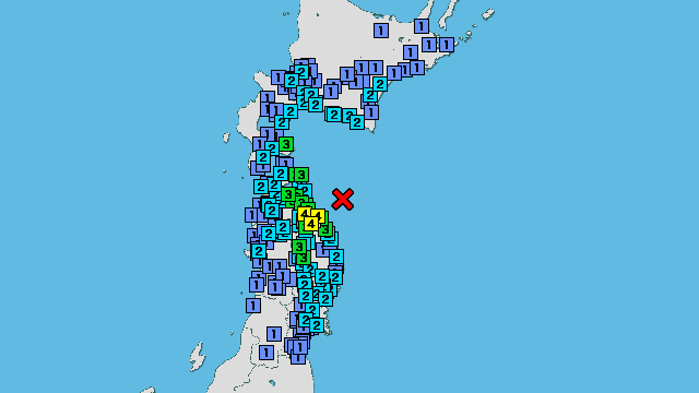 | 震度3 | 登米市豊里町 登米市登米町 涌谷町新町裏 石巻市北上町 石巻市桃生町 |
