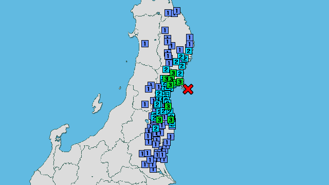 | 震度3 | 一関市千厩町 一関市藤沢町 大崎市田尻 涌谷町新町裏 |