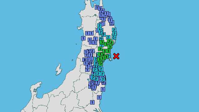 | 震度3 | 大船渡市大船渡町 大船渡市猪川町 住田町世田米 一関市大東町 一関市花泉町 一関市千厩町 一関市東山町 一関市室根町 一関市藤沢町 奥州市江刺 奥州市前沢 奥州市衣川 気仙沼市赤岩 気仙沼市笹が陣 気仙沼市唐桑町 登米市中田町 登米市豊里町 登米市南方町 登米市石越町 登米市米山町 栗原市瀬峰 栗原市志波姫 栗原市若柳 大崎市古川三日町 大崎市古川大崎 大崎市古川旭 大崎市松山 大崎市鹿島台 大崎市田尻 涌谷町新町裏 南三陸町歌津 名取市増田 仙台宮城野区五輪 仙台宮城野区苦竹 仙台若林区遠見塚 仙台泉区将監 石巻市桃生町 東松島市矢本 松島町高城 |