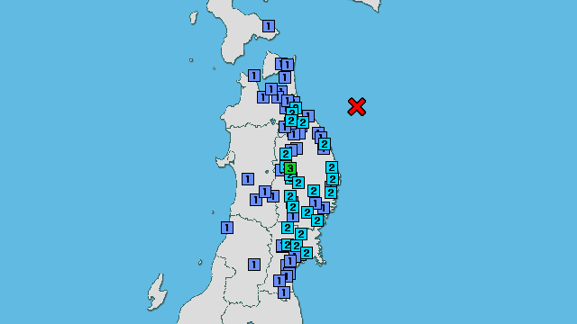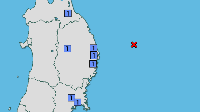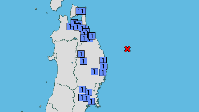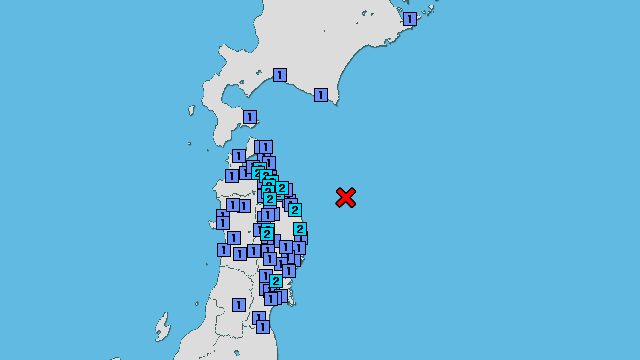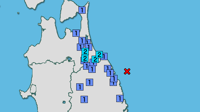 | 震度5弱 | 八戸市内丸 八戸市南郷 七戸町森ノ上 東北町上北南 おいらせ町中下田 五戸町古舘 青森南部町苫米地 宮古市田老 普代村銅屋 盛岡市薮川 盛岡市渋民 二戸市浄法寺町 八幡平市田頭 矢巾町南矢幅 花巻市材木町 登米市迫町 涌谷町新町裏 |