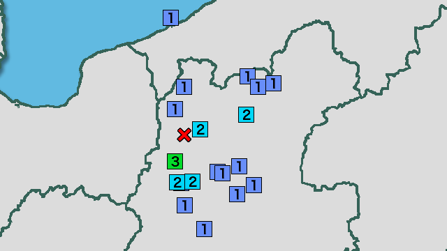 | 震度4 | 長野市大岡 長野市信州新町新町 大町市役所 大町市大町図書館 松川村役場 小川村高府 生坂村役場 |