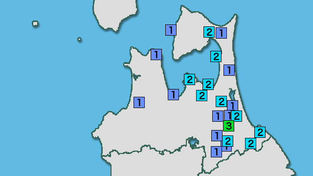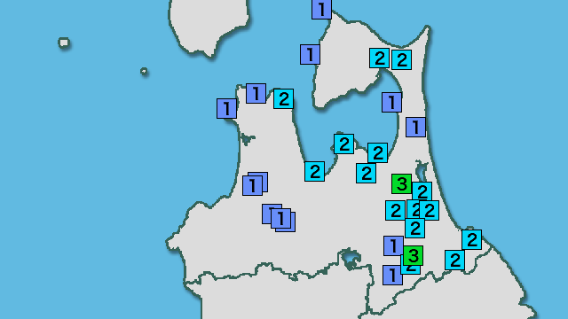 | 震度1 | 東北町塔ノ沢山 青森南部町沖田面 八戸市湊町 十和田市奥瀬 横浜町林ノ脇 横浜町寺下 六ヶ所村尾駮 六ヶ所村出戸 田子町田子 新郷村戸来 青森市浪岡 平内町東田沢 五所川原市敷島町 五所川原市金木町 つがる市柏 つがる市稲垣町 つがる市車力町 つがる市木造 今別町今別 中泊町中里 むつ市川内町 むつ市脇野沢 東通村砂子又蒲谷地 東通村白糠 大間町大間 佐井村長後 平川市柏木町 藤崎町西豊田 藤崎町水木 田舎館村田舎館 |