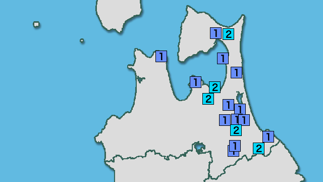 | 震度1 | 八戸市内丸 七戸町七戸 五戸町倉石中市 十和田市西十二番町 十和田市奥瀬 三沢市桜町 六戸町犬落瀬 横浜町林ノ脇 横浜町寺下 東北町上北南 東北町塔ノ沢山 六ヶ所村尾駮 六ヶ所村出戸 おいらせ町中下田 おいらせ町上明堂 三戸町在府小路町 青森南部町沖田面 青森南部町苫米地 青森南部町平 階上町道仏 東通村砂子又蒲谷地 東通村尻屋 東通村白糠 むつ市金曲 むつ市金谷 むつ市大畑町中島 むつ市川内町 むつ市脇野沢 平内町小湊 平内町東田沢 外ヶ浜町蟹田 |