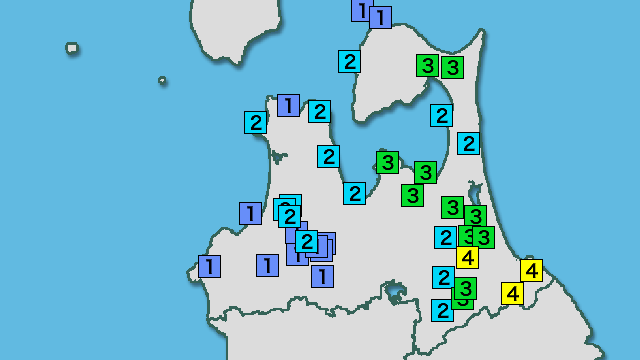 | 震度1 | 外ヶ浜町平舘 青森市花園 青森市中央 青森市浪岡 五所川原市敷島町 五所川原市相内 五所川原市金木町 つがる市柏 つがる市森田町 つがる市稲垣町 つがる市車力町 つがる市木造 今別町今別 蓬田村阿弥陀川 鶴田町鶴田 中泊町中里 八戸市島守 七戸町七戸 横浜町寺下 東北町塔ノ沢山 おいらせ町上明堂 青森南部町沖田面 十和田市西二番町 十和田市西十二番町 十和田市奥瀬 六ヶ所村尾駮 六ヶ所村出戸 田子町田子 新郷村戸来 むつ市大畑町奥薬研 むつ市脇野沢 東通村砂子又蒲谷地 東通村尻屋 東通村白糠 大間町大間 風間浦村易国間 佐井村長後 藤崎町西豊田 藤崎町水木 |