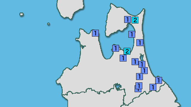 | 震度2 | 八戸市湊町 七戸町七戸 青森南部町沖田面 十和田市西二番町 十和田市西十二番町 十和田市奥瀬 三沢市桜町 横浜町林ノ脇 横浜町寺下 東北町上北南 東北町塔ノ沢山 六ヶ所村尾駮 三戸町在府小路町 田子町田子 階上町道仏 新郷村戸来 東通村砂子又蒲谷地 むつ市金曲 むつ市金谷 むつ市大畑町中島 むつ市川内町 青森市花園 青森市中央 青森市浪岡 五所川原市栄町 五所川原市敷島町 五所川原市金木町 つがる市柏 つがる市稲垣町 つがる市車力町 つがる市木造 平内町小湊 平内町東田沢 蓬田村阿弥陀川 外ヶ浜町蟹田 鶴田町鶴田 中泊町中里 藤崎町水木 |