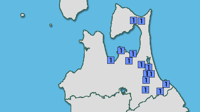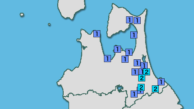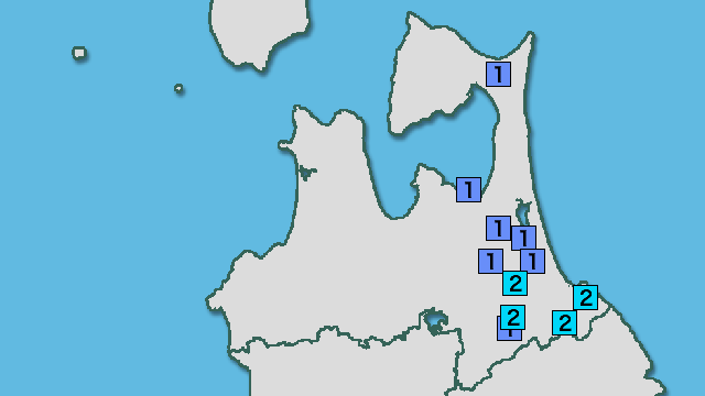 | 震度1 | 青森市花園 平内町小湊 八戸市内丸 八戸市南郷 三沢市桜町 野辺地町野辺地 七戸町森ノ上 七戸町七戸 六戸町犬落瀬 東北町上北南 おいらせ町中下田 おいらせ町上明堂 五戸町古舘 五戸町倉石中市 青森南部町苫米地 青森南部町平 階上町道仏 むつ市大畑町中島 東通村砂子又沢内 |
