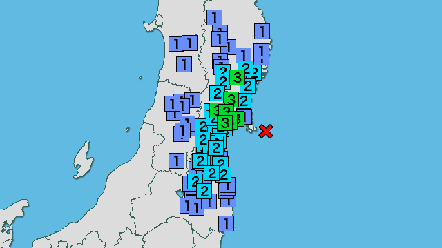 発生日時 2026年4月12日 22時00分ごろ 地震発生日時 2026年4月12日 22時00分ごろ 震源地 宮城県沖 最大震度 震度3 地震の規模(マグニチュード) 4.7 震源の深さ 60km 震源の緯度/経度 北緯38.2度/東経141.8度 津波情報 この地震による津波の心配はありません。 震度 観測地点 震度3 一関市花泉町 登米市東和町 登米市南方町 大崎市田尻 涌谷町新町裏 石巻市桃生町 東松島市矢本 松島町高城 発生日時 2026年4月11日 18時49分ごろ 地震発生日時 2026年4月11日 18時49分ごろ 震源地 釧路沖 最大震度 震度2 地震の規模(マグニチュード) 5.3 震源の深さ 10km 震源の緯度/経度 北緯41.8度/東経146.4度 津波情報 この地震による津波の心配はありません。 震度 観測地点 震度1 五戸町古舘 発生日時 2026年4月11日 18時10分ごろ 地震発生日時 2026年4月11日 18時10分ごろ 震源地 岩手県沿岸北部 最大震度 震度2 地震の規模(マグニチュード) 3.9 震源の深さ 60km 震源の緯度/経度 北緯39.8度/東経141.8度 津波情報 この地震による津波の心配はありません。 震度 観測地点 震度1 八戸市南郷 青森南部町苫米地 階上町道仏